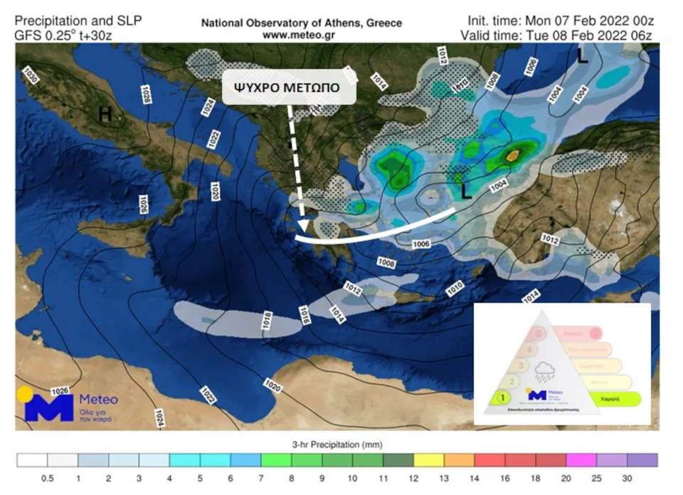 Σύμφωνα με τα προγνωστικά στοιχεία του Εθνικού Αστεροσκοπείου Αθηνών, ένα ψυχρό μέτωπο αναμένεται να διασχίσει ταχύτατα τη χώρα από τις πρώτες βραδινές ώρες της Δευτέρας 7/2 και από τα βόρεια. Κατά τη διάρκεια της σημερινής ημέρας το μέτωπο θα επηρεάσει πρόσκαιρα πολλές περιοχές της χώρας μας. Κατά τη διέλευσή του, το ψυχρό μέτωπο αναμένεται να προκαλέσει πτώση της θερμοκρασίας της τάξης των 9-10 βαθμών Κελσίου σε πολύ μικρό χρονικό διάστημα και ενίσχυση των ανέμων κατά τόπους σε θυελλώδεις, με εντάσεις 8 μποφόρ και ριπές πολύ υψηλών ταχυτήτων. Παράλληλα, θα εκδηλωθούν βροχοπτώσεις, καταιγίδες κυρίως στη βορειοανατολική χώρα και στο Αιγαίο, και πρόσκαιρες χιονοπτώσεις τόσο σε ορεινά και ημιορεινά τμήματα όσο και σε περιοχές χαμηλού υψομέτρου από τη Στερεά Ελλάδα και βορειότερα.
