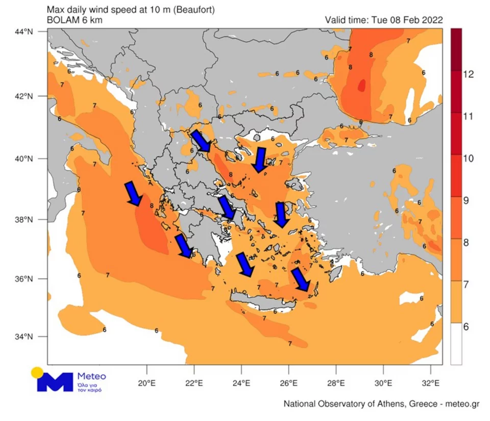 Στον προγνωστικό χάρτη που ακολουθεί φαίνονται οι περιοχές όπου θα πνέουν οι ισχυρότεροι άνεμοι την Τρίτη 8/2 καθώς και οι επικρατούσες διευθύνσεις τους.